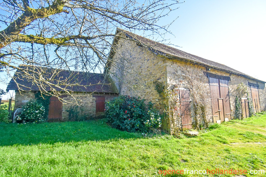 Het huis, op het zuidwesten gelegen, ligt aan een kleine departementale weg. De gebouwen hebben een U-vorm met aan de ene kant de twee schuren en de varkensstallen en aan de andere kant de broodoven, de waterput en de barbecue. Tussen deze gebouwen in, ligt een grote centrale binnenplaats waar gemakkelijk meerdere auto’s kunnen worden geparkeerd. De schuren zijn in goede staat en hebben een goed dak met platte dakpannen. De eerste (ca. 110 m²) had oorspronkelijk twee stallen. Een daarvan is verwijderd. De andere is gedeeltelijk ingericht als wasruimte/zomerkeuken. De tweede schuur, die aan de eerste grenst, was een hooischuur. Deze beschikt dus over een open ruimte tot aan de nok van ongeveer 72 m² vloeroppervlak. Het porcherie-gebouwtje (varkensstallen van ca. 20 m²) kan dienen als berging of kippenhok. De achterkant van het gebouw komt direct uit op het weiland. Aangrenzend aan deze varkensstallen staan twee mooie schuren.