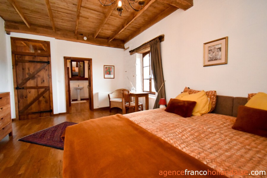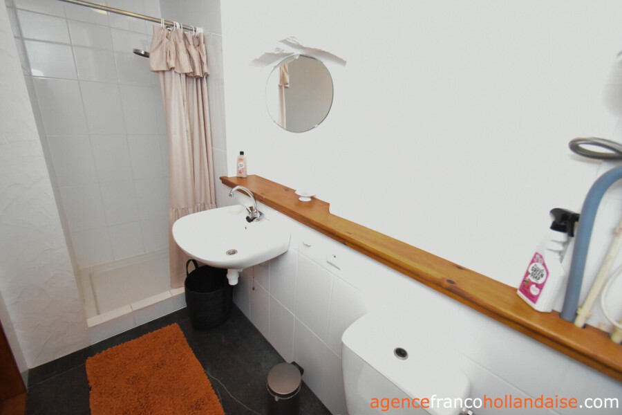 De 3e woning aan de linkerkant van het gebouw. Op de begane grond is ook een grote leefruimte met een houtkachel, een keukenhoek, een werkkamer en een toilet. Op de verdieping zijn twee ruime slaapkamers met eigen badkamer.