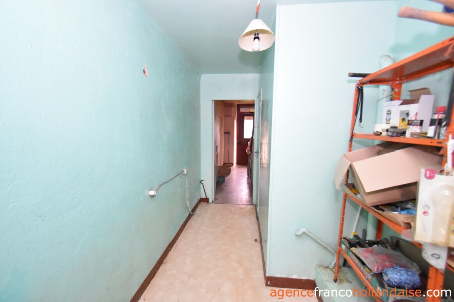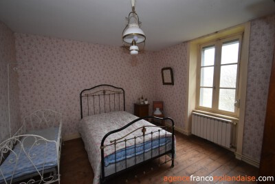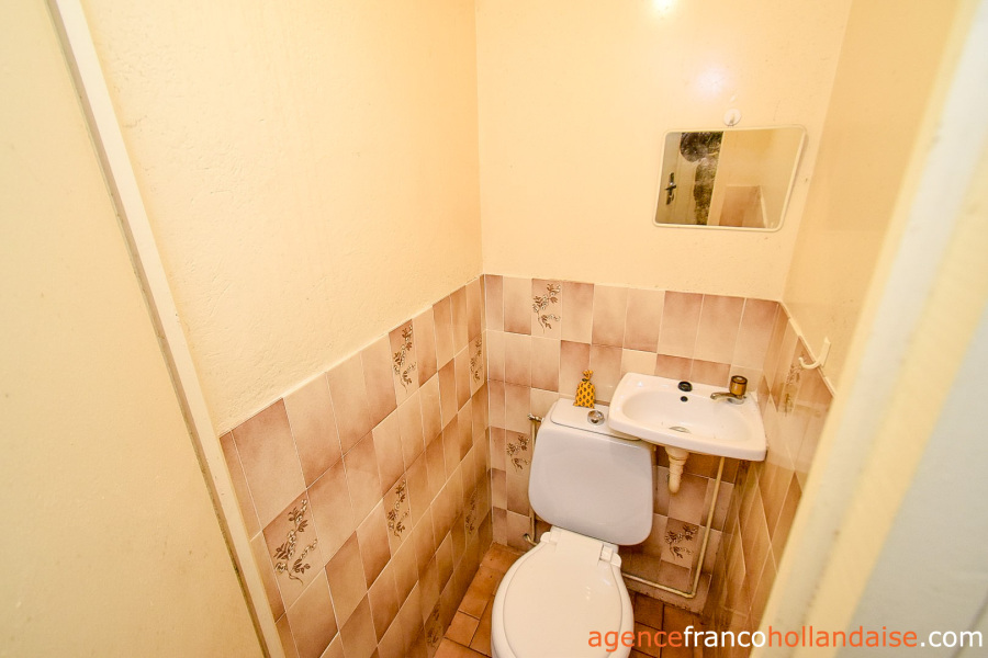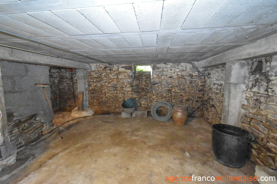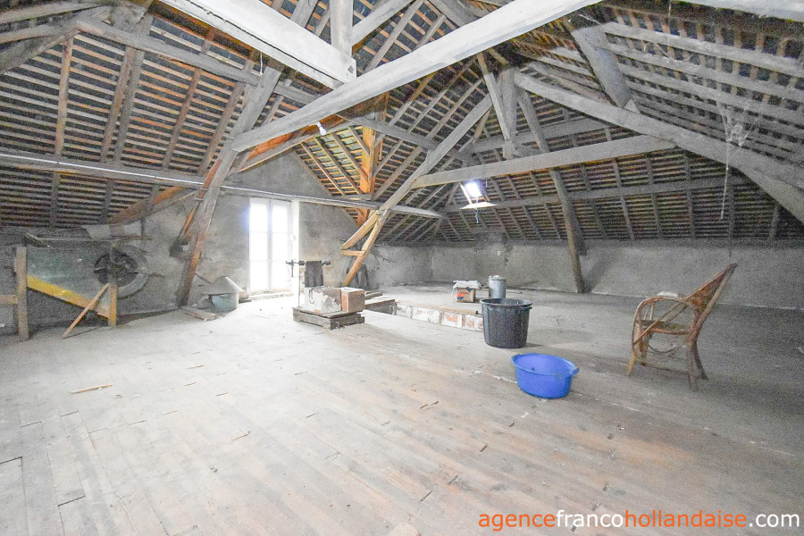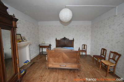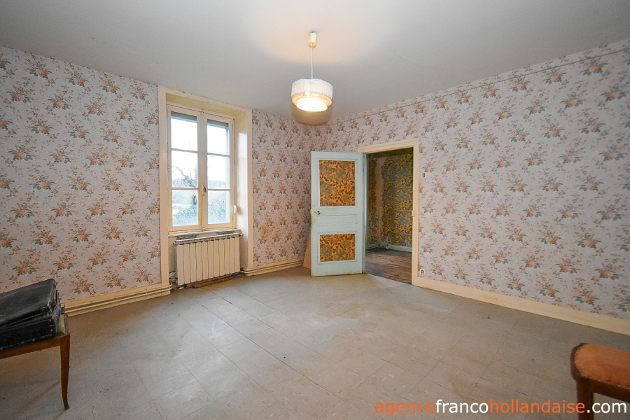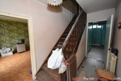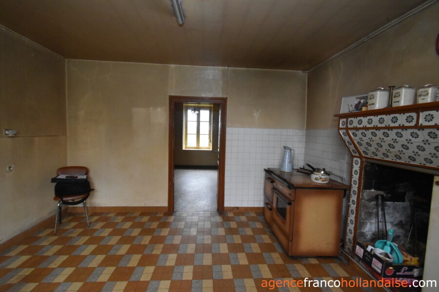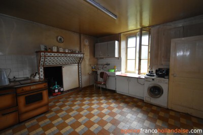 Het is een mooi vrijstaand huis met meer karakter dan de boerderijen die we in onze regio kennen. Met zijn zuidwestelijke gepleisterde voorgevel en zijn karakteristieke “chien assis” (dakkapel), typisch voor stenen gebouwen uit de jaren 1920-1930, beschikt het huis op de begane grond uit een centrale hal met aan de linkerzijde een woonkamer met tegelvloer en kachel (ca. 31,5 m²). Aan de rechterzijde zich een keuken (ca. 16,5 m²) op een betonnen vloer met open haard en een houtkachel voor de CV. In het verlengde van deze kamer ligt een eetkamer (ca. 14,5 m²) met de karakteristieke mozaïektegels. In de hal is een toilet en een trap naar de kelder (ca. 13 m²).