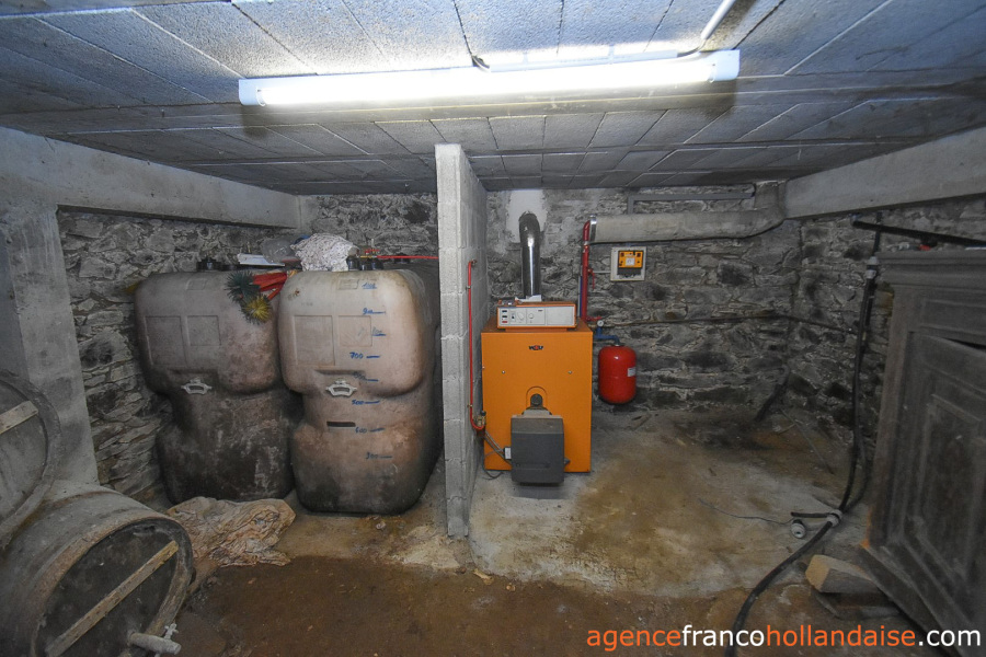 De kelder is toegankelijk vanuit de gang of via een buitendeur en bevat de centrale verwarming op stookolie. Alle bewoonbare kamers van het huis zijn uitgerust met gietijzeren radiatoren. Er zijn 3 bestaande schouwen, waarvan een dubbele in de keuken, waarop het fornuis is aangesloten. Het ligt voor de hand om hier houtkachels te plaatsen.