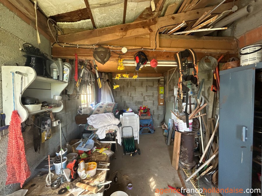 Er is aan de voorzijde een plateau gemaakt voor een opzetzwembad. Een garage/kelder onder het terras en een schuurtje met houthok en overkapping dat aan de zijkant van het perceel staat maken het geheel compleet.