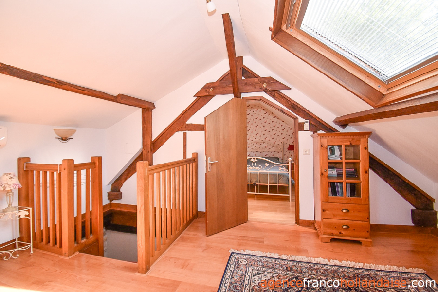 Een mooie massief houten trap in de woonkamer leidt naar de 1e verdieping. Een overloop (ca. 9 m²) met dakraam geeft toegang tot de slaapkamer, gelegen onder de schuine kap met een dakraam en knieschotten voor extra bergruimte. De overloop is licht door het dakraam en een deur met veel glas. Er is een tweede deur naar een kleine zolderruimte die zich boven de badkamer bevindt. De verdieping wordt in de winter verwarmd door de warmtepomp en in de zomer gekoeld door de airconditioning van dezelfde pomp. Op de overloop bevindt zich ook de elektrische boiler van het huis.