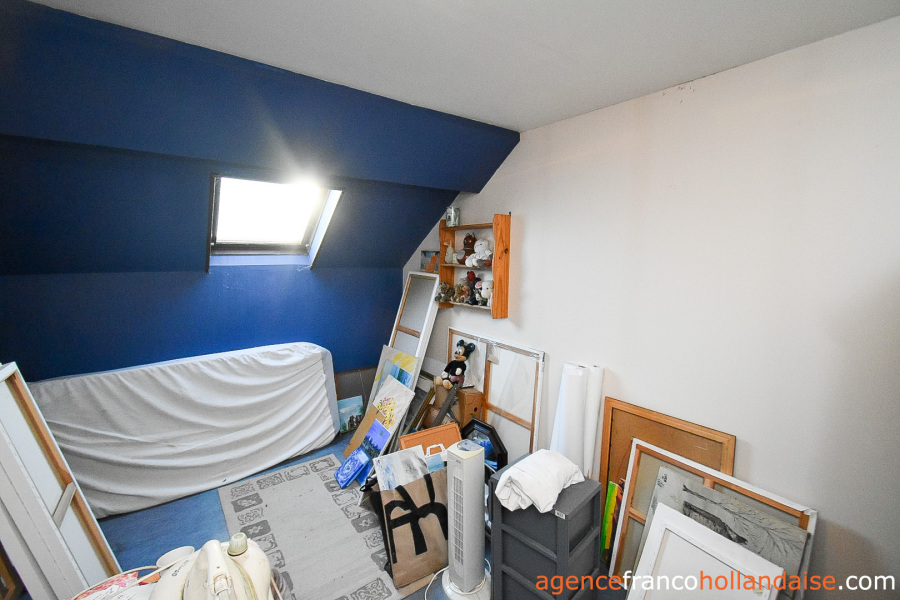 Een massief houten trap leidt vanuit de woonkamer naar de eerste verdieping met een ruimte overloop (ca. 13 m²) met een bureauhoek onder het dakraam (noordoostzijde). Links is een grote slaapkamer (ca. 21 m²) onder het schuine dak met een dakraam aan de zuidkant. In het midden van de overloop een badkamer (ca. 4 m² op 1,80 m hoogte) met toilet en dakraam aan de zuidkant. Rechts van de overloop zijn er 2 slaapkamers met dakraam (ca. 7,5 m² en 11,5 m²) voorzien van een laminaatvloer.
