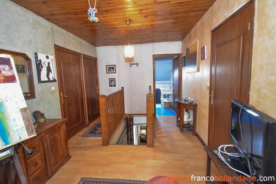 Het woonhuis met haar aangrenzende stenen schuur is op het zuidwesten gericht en is voorzien van een leiendak uit 2005. U komt direct in de woonkamer (ca. 22 m²) met traditionele stenen vloer en open haard, waarin een moderne pelletkachel is geïnstalleerd. Vanuit deze ruimte is er een doorgang naar de eetkeuken (ca. 13 m²). ER is een hoek met een bijkeuken/stookruimte (ca. 4 m²) met de recente lucht-water-warmtepomp en de hybride thermodynamische zonneboiler. Links van de woonkamer bevindt zich een eetkamer (ca. 17 m²) met massieve vloeren en ruimte voor een houtkachel. Links van de keuken is in de slaapkamer (ca. 13 m²) met massieve vloeren een eigen badkamer en toilet toegevoegd om gelijkvloers te kunnen wonen.