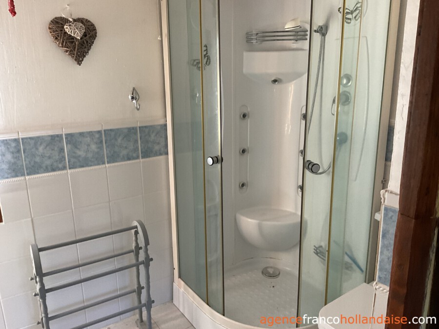 Op de verdieping is de gîte bestaande uit een woonkamer met keuken, badkamer, een slaapkamer en een balkon/terras.