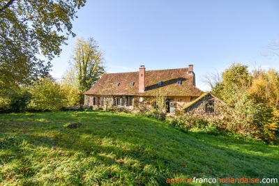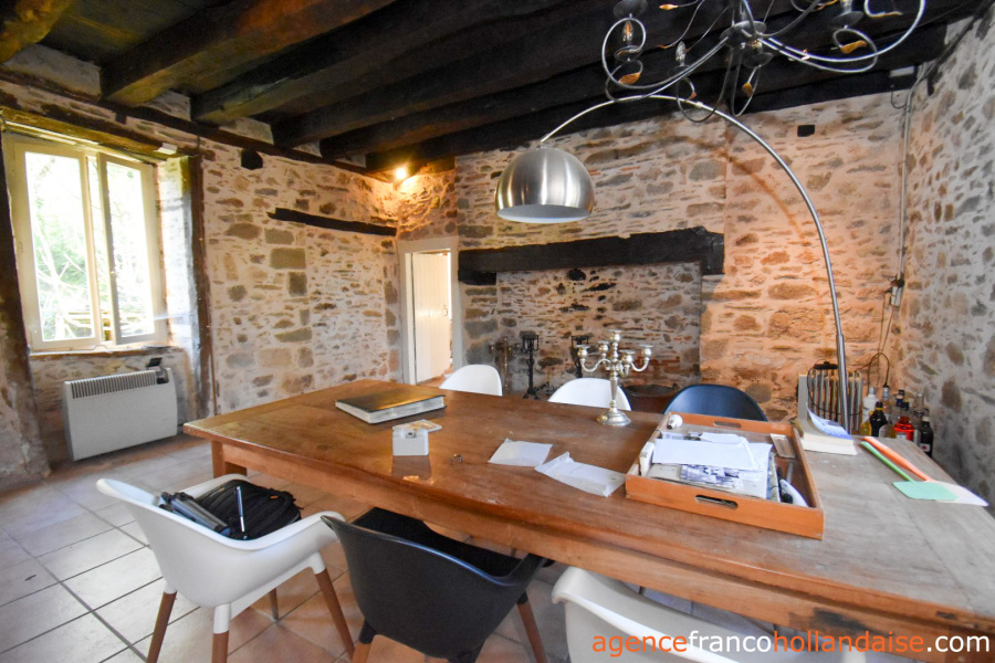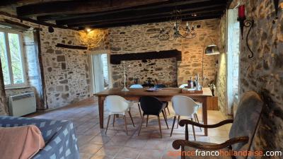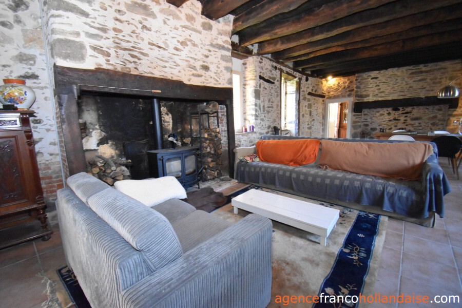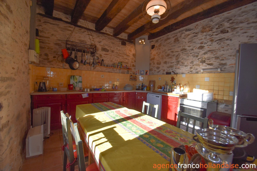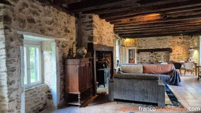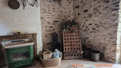 Oude balken plafond, stenen wanden en vele originele details verraden het bouwjaar van 1742 in dit sfeervolle maison de campagne van bijna 20 meter lang en 5.50 meter breed. Je komt het huis binnen door een mooie antieke kasteeldeur. Vanuit de hal met toilet bereik je de lange woonkamer met twee schouwen waarvan één met een houtkachel die het huis verwarmt. De naastgelegen keuken is van alle gemakken voorzien en groot genoeg voor een eettafel. Als je een raam vervangt voor een deur heb je meteen een doorloop naar de prachtige tuin.