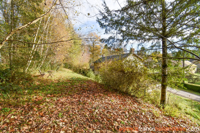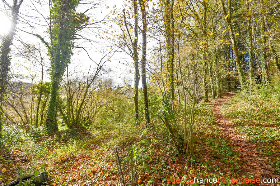 Het terrein heeft een totale oppervlakte van 3.800 m² en wordt in het noorden begrensd door een klein gemeentelijk pad en in het zuiden door het gehuchtweggetje. Er is een gazon vlak voor het huis. Hier kunt u een tafel en stoelen neerzetten om buiten te eten. Het onderhoud is eenvoudig en u heeft geen grote zitmaaier nodig om de tuin te onderhouden. Voor het huis is een stenen terras en kan de auto geparkeerd worden. Omdat er zo weinig verkeer langskomt, hebben de huidige bewoners nooit een heggetje of afscheiding geplant. Het perceel bestaat aan de achterzijde van de woning voornamelijk uit bos : volwassen dennenbomen voor de kap. Het is bereikbaar via een kleine trap. Een kleine beek loopt langs het terrein in het zuiden, tussen een klein gemeentelijk perceel en de straat.
