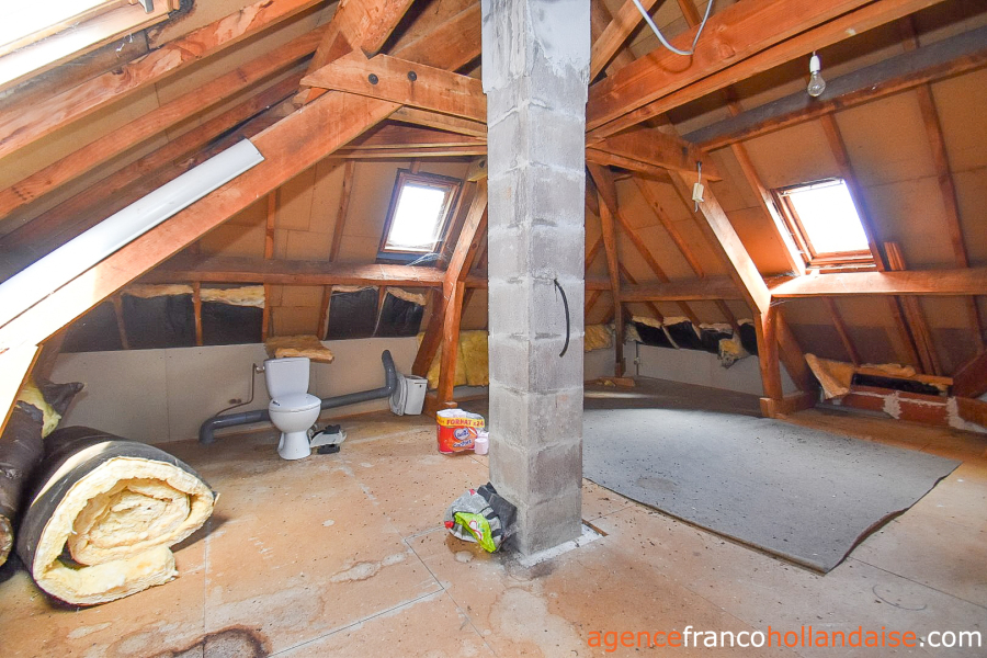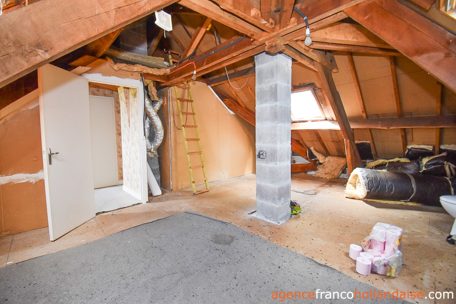 De zolder is bereikbaar via een open trap in de woonkamer. Een kleine overloop (ca. 1,5 m²) leidt naar twee slaapkamers die zijn gecreëerd in de zolderruimte (ca. 13,5 m² & 10 m²), maar die twee ramen hebben, waarvan één met uitzicht op het zuidoosten. Er is een open zolder (ca. 14 m²) met 3 dakramen die nog omgetoverd kan worden tot extra slaapkamer. Er is al een toilet aanwezig.