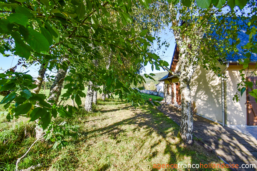 Muurtjes ondersteunen de helling en er staan al meerdere fruitbomen (appelbomen, kersenbomen). Aan het einde van het geasfalteerde terras bevindt zich een houten schuur waar tuinmeubilair en gereedschap kunnen worden opgeborgen.