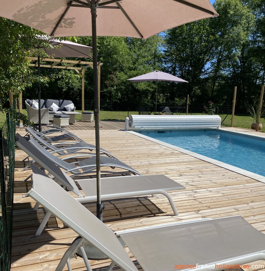 Het perceel van bijna 1 hectare bestaat uit een parkachtige tuin met gazons, fruitbomen, moestuin en borders met bloemen. Voor de woning is ruime parkeergelegenheid aanwezig. Achter het huis ligt een fraai aangelegd zwembad van 4 x 8 meter, perfect geïntegreerd in de natuurlijke omgeving — een heerlijke plek om in alle rust te genieten van zonnige dagen.